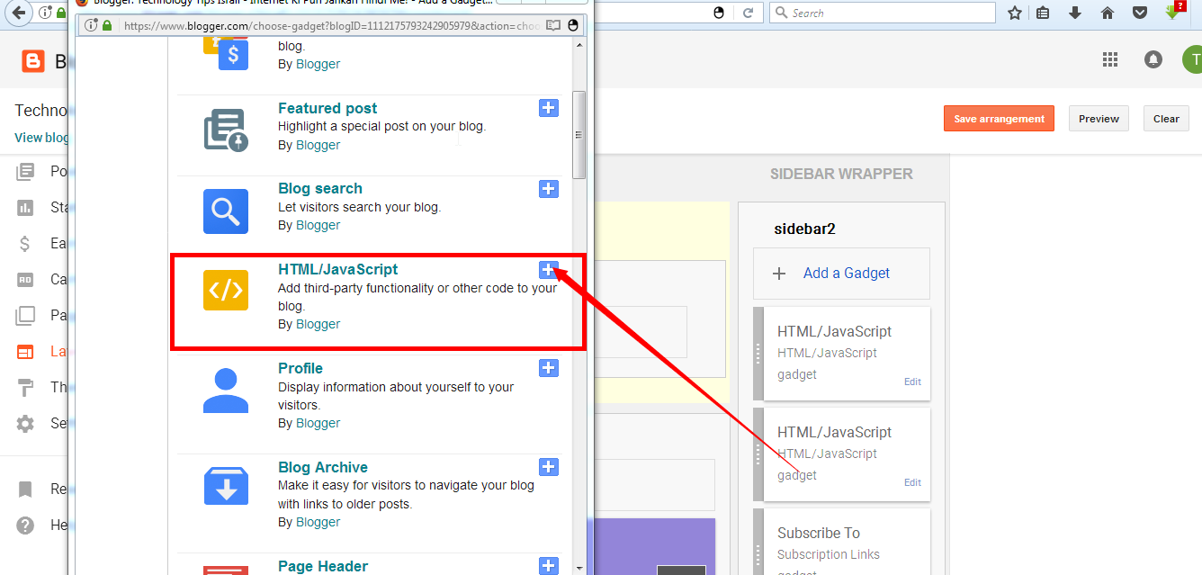 Gadget Par Click karne ke bad aap ke samne ek popup window open ho jayega aap ko HTML/JavaScript ko dhundna hai or aap ko Plus (+) Dikhega aap ko waha par Click karna hai kiyu ki aap ne jo code copy kiya hai wo HTML/JavaScript code hai niche aap ko Screenshot Diya hai.