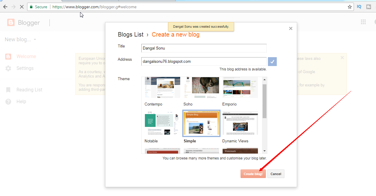 9. To Dosto Itna Karne ke Bad Aap ka Blog proper tarike se Create yani Tayar. hojayega. Aap Niche Screenshot Diya ha aap dekh sakte hai ko hamara blog create hogaya hai