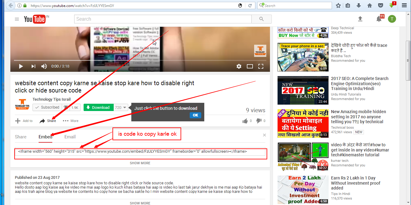 Ab aap ko Shear par Click karna hai or Uske bad aap ko Embed Par Click karna hai jaise Click kijyega aap ko Ek HTML Code dikhega aap us code ko copy karle ok maine Example me screenshot laga diya hai aap khud dekh sakte ho